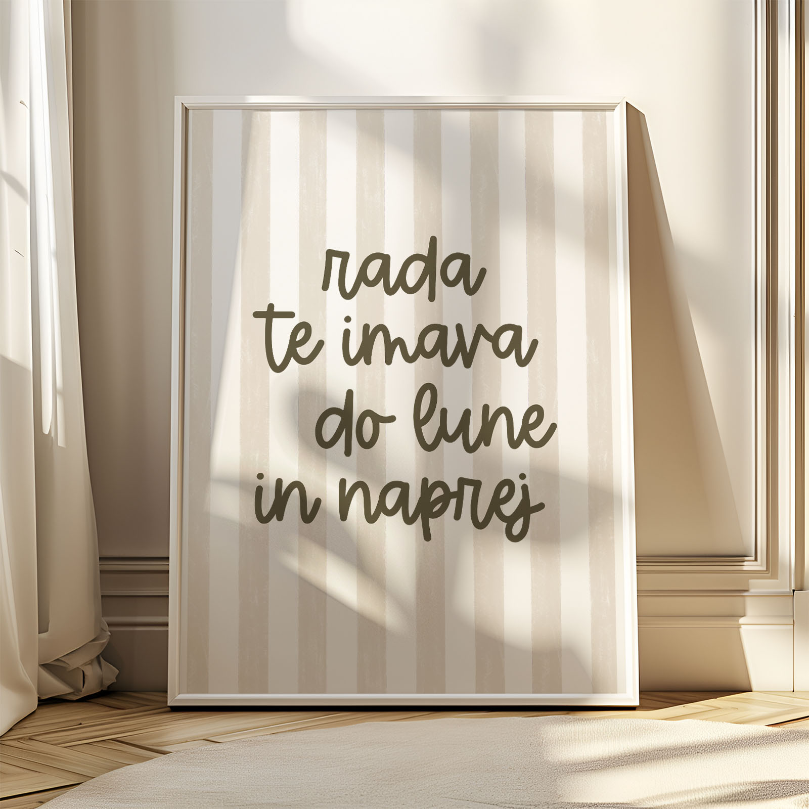 Dekorativni plakat z napisom Rada te imava… za otroško sobo je čudovit način, da prostoru dodate osebno noto in ustvarite prijetno, umirjeno vzdušje. Nežni napisi in skrbno izbran dizajn dopolnjujejo otroško sobo ter ustvarjajo občutek topline in domačnosti.