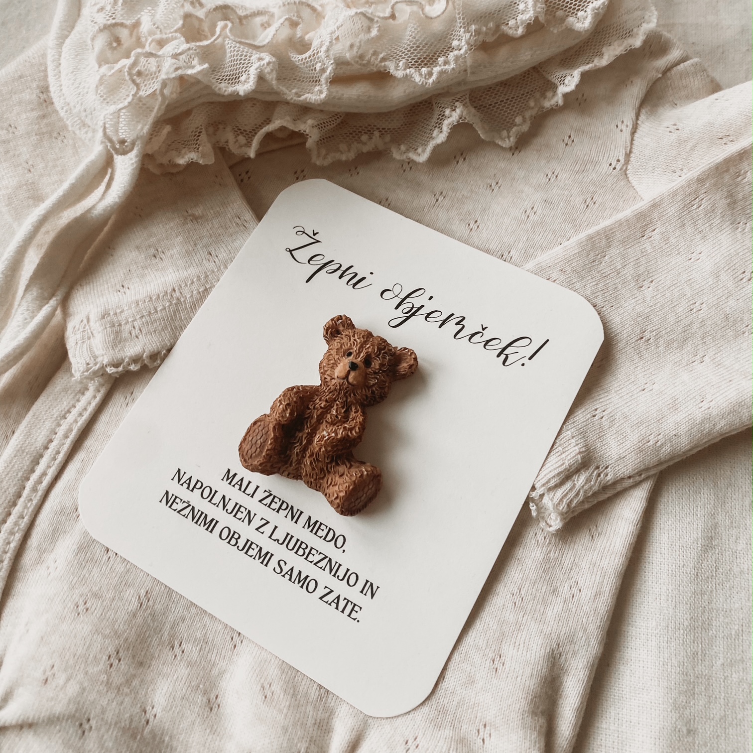 Podari nežen spominček, ki ogreje srce. Ta mini medvedek prinaša toplino, ljubezen in nežne objeme povsod s seboj. Popolno darilo za vsakogar, ki potrebuje nasmeh ali malo sreče.